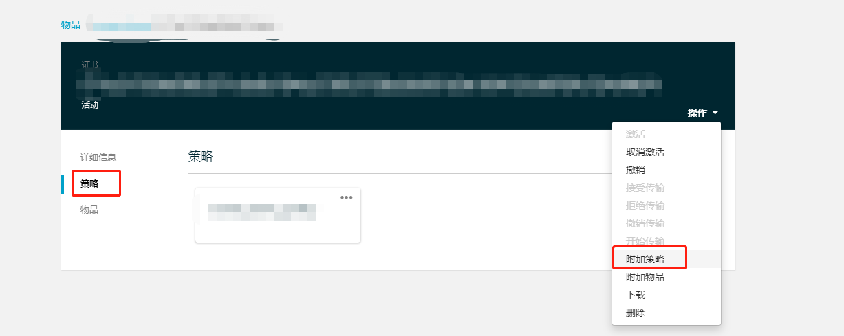 - 打开AWS控制台->服务中找到AWS IoT->管理->物品->操作->附加策略